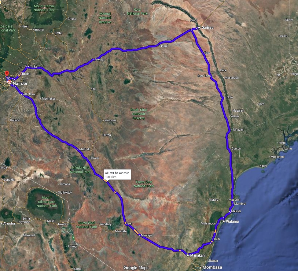 The usual Voi route from Nairobi to Watamu is a long, familiar haul of roughly 580km. This time though, Joe and I are craving something different. So we consider the slightly wilder option through Garissa, stretching it to about 740km in total. This beautiful ride report on YouTube whets our appetite!