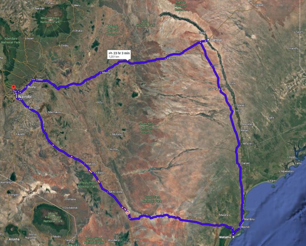 The usual Voi route from Nairobi to Watamu is a long, familiar haul of roughly 580km. This time though, Joe and I are craving something different. So we consider the slightly wilder option through Garissa, stretching it to about 740km in total. This beautiful ride report on YouTube whets our appetite!